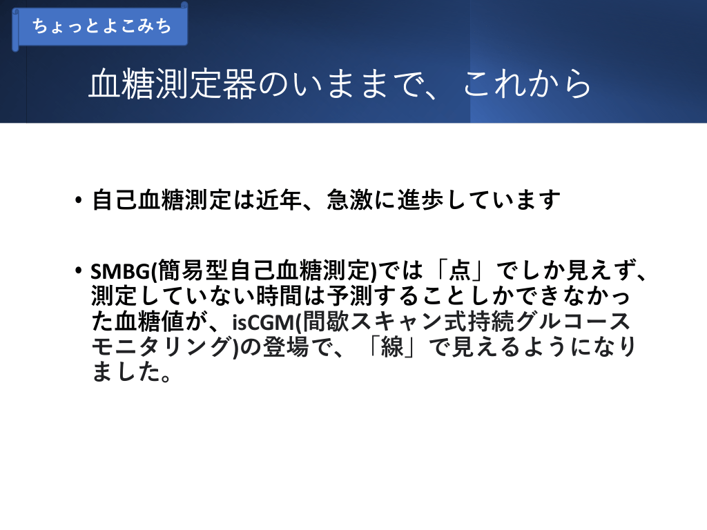 ちょっとよこみち 血糖測定器のいままで、これから • 自己血糖測定は近年、急激に進歩しています • SMBG(簡易型自己血糖測定)では「点」でしか見えず、 測定していない時間は予測することしかできなかっ た血糖値が、isCGM(間歇スキャン式持続グルコース モニタリング)の登場で、「線」で見えるようになり ました。 #9.