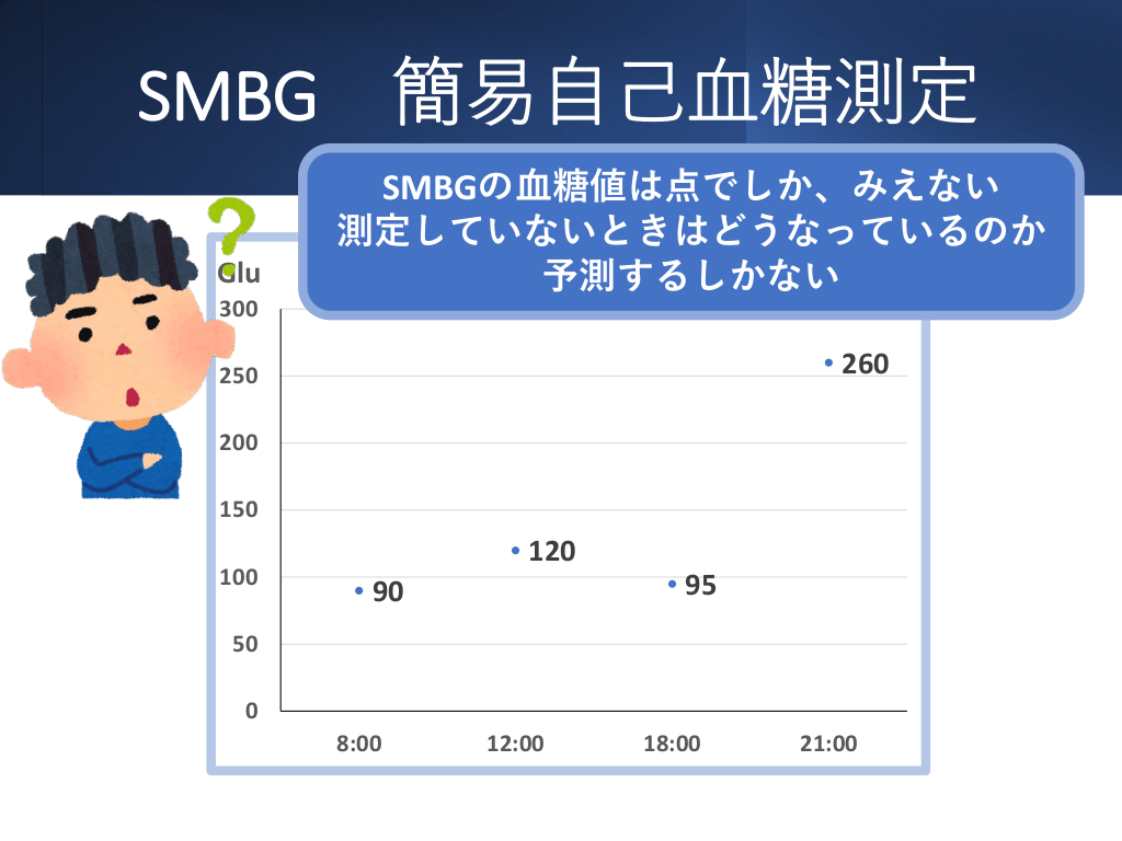 SMBG 簡易自己血糖測定 Glu 300 SMBGの血糖値は点でしか、みえない 測定していないときはどうなっているのか 予測するしかない 260 250 200 150 100 90 120 95 50 0 8:00 12:00 18:00 21:00 #10.
