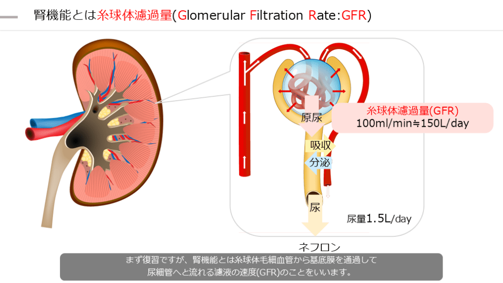 100ml/min≒150L/day まず復習ですが、腎機能とは糸球体毛細血管から基底膜を通過して