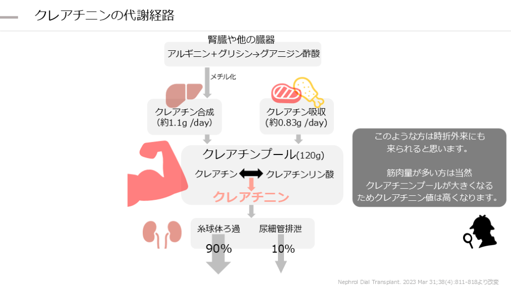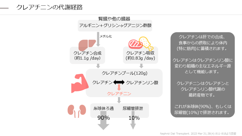 (約0.83g /day) クレアチンプール(120g) クレアチン クレアチンリン酸 クレアチ二ン 糸球体ろ過 尿細管排泄 90% 10% Nephrol Dial Transplant. 2023 Mar 31;38(4):811-818より改変