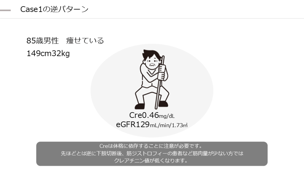 eGFR129mL/min/1.73㎡ Case1の逆パターン Creは体格に依存することに注意が必要です。