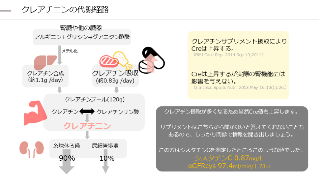 (約0.83g /day) クレアチン摂取が多くなるため当然Cre値も上昇します。