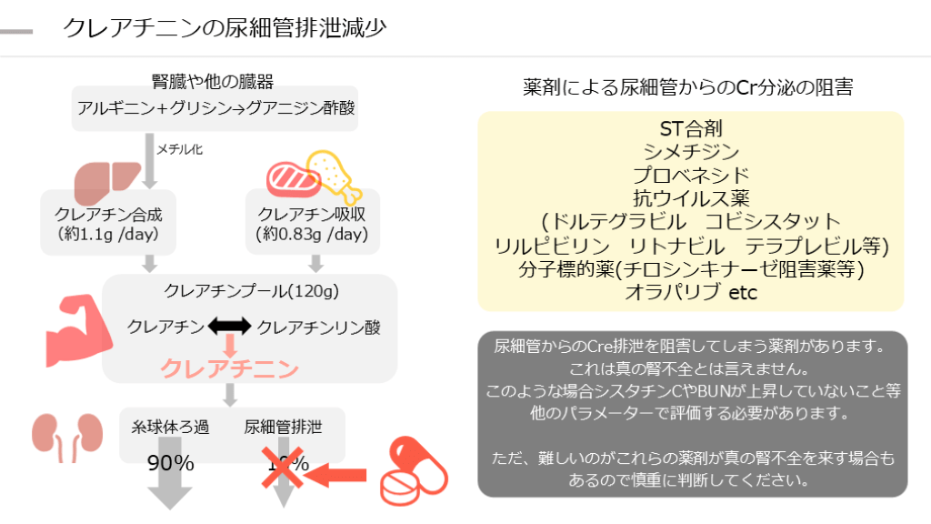 (約0.83g /day) クレアチンプール(120g) クレアチン クレアチンリン酸 クレアチ二ン 糸球体ろ過 尿細管排泄 90% 10% 薬剤による尿細管からのCr分泌の阻害 尿細管からのCre排泄を阻害してしまう薬剤があります。