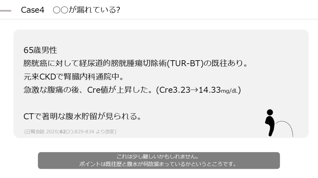 CTで著明な腹水貯留が見られる。 (日腎会誌 2020;62(2):829‒834 より改変) これは少し難しいかもしれません。