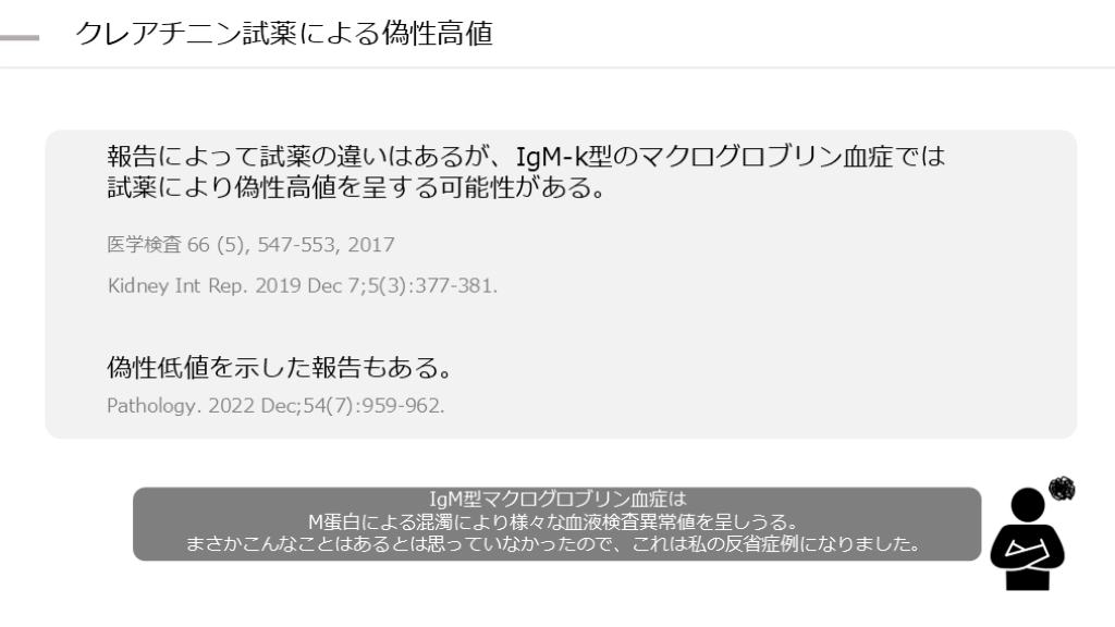 #26. クレアチニン試薬による偽性高値 偽性低値を示した報告もある。 報告によって試薬の違いはあるが、IgM-k型のマクログロブリン血症では