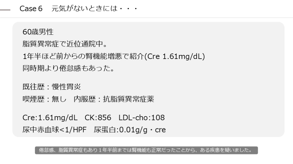 尿中赤血球<1/HPF 尿蛋白:0.01g/g・cre 倦怠感、脂質異常症もあり1年半前までは腎機能も正常だったことから、ある疾患を疑いました。