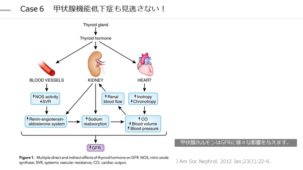 #29. Case6 甲状腺機能低下症も見逃さない! J Am Soc Nephrol. 2012 Jan;23(1):22-6. 甲状腺ホルモンはGFRに様々な影響を与えます。
