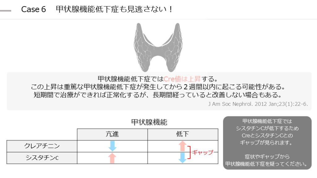 #30. Case6 甲状腺機能低下症も見逃さない! 甲状腺機能低下症ではCre値は上昇する。