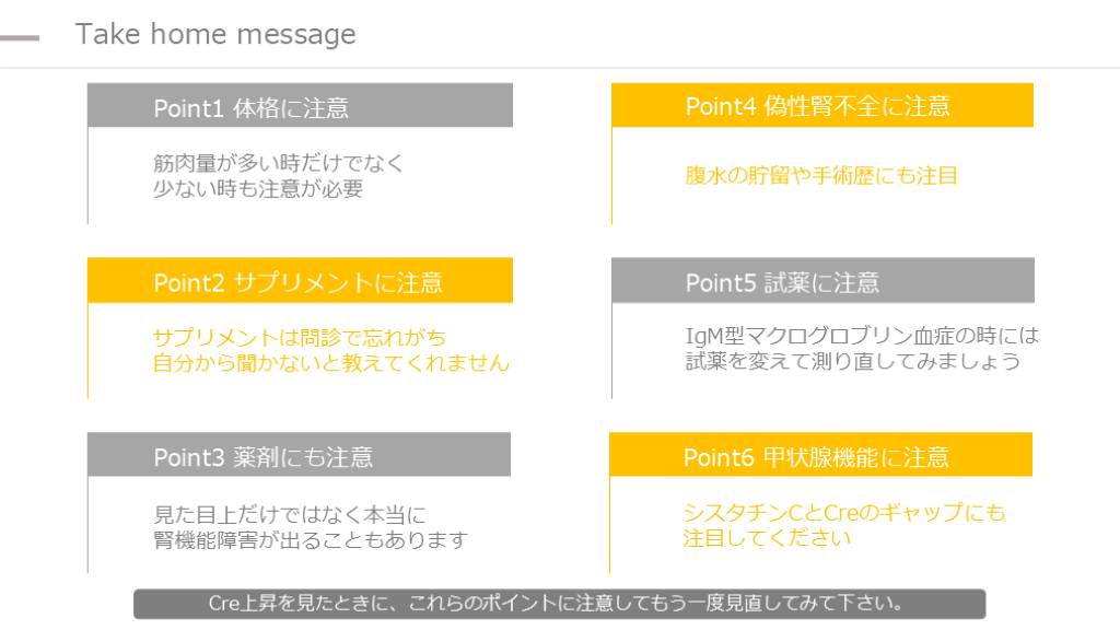 #31. Take home message Point1 体格に注意 Point2 サプリメントに注意 Point3 薬剤にも注意 Point4 偽性腎不全に注意 Point5 試薬に注意 筋肉量が多い時だけでなく