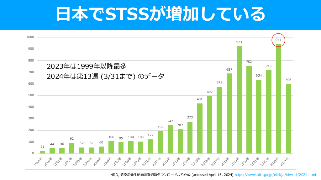 #10. 1000 941 923 900 800 752 2023年は1999年以降最多 2024年は第13週 (3/31まで) のデータ 700 600 716 687 634 596 573 492 500 431 400 300 273 242 207 192 200 106 92 100 52 46 44 21 95 60 52 104 122 103 NIID, 感染症発 年 20 24 年 20 23 年 20 22 年 20 21 年 20 20 年 20 19 年 20 18 年 20 17 年 20 16 年 20 15 年 20 14 年 20 13 年 20 12 年 20 11 年 20 10 年 20 09 年 20 08 年 20 07 年 20 06 年 20 05 年 20 04 年 20 03 年 20 02 年 20 01 年 00 20 19 99 年 0 生 日 本でSTSSが増加している 動向調査週報ダウンロードより作成 (accessed April 16, 2024) https://www.niid.go.jp/niid/ja/idwr-dl/2024.html