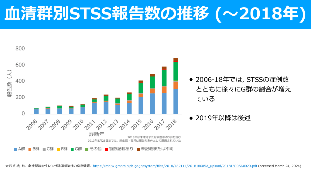 #11. • 2006-18年では, STSSの症例数 とともに徐々にG群の割合が増え ている • 2019年以降は後述 性レンサ球菌感染症の疫学情報.https://mhlw-grants.niph.go.jp/system/ les/2018/182111/201818005A_upload/201818005A0020.pdf (accessed March 24, 2024) fi 血 和徳, 他.劇症型溶 石 大 血 清群別STSS報告数の推移 (〜2018年)