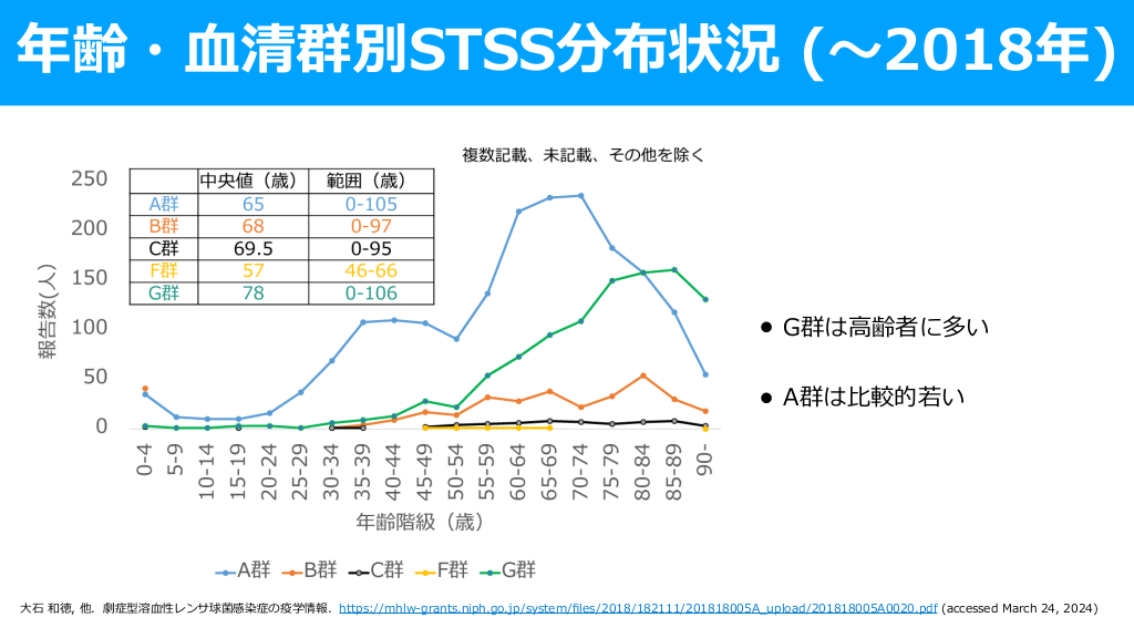 #12. 清群別STSS分布状況 (〜2018年) • G群は 齢者に多い • A群は 較的若い fi 性レンサ球菌感染症の疫学情報.https://mhlw-grants.niph.go.jp/system/ les/2018/182111/201818005A_upload/201818005A0020.pdf (accessed March 24, 2024) 血 血 高 比 和徳, 他.劇症型溶 石 大 年齢・