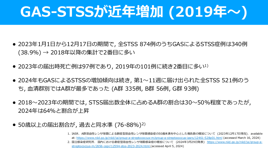 #13. GAS-STSSが近年増加 (2019年〜) • 2023年1 1 から12 17 の期間で, 全STSS 874例のうちGASによるSTSS症例は340例 (38.9%) → 2018年以降の集計で2番 に多い • 2023年の届出時死亡例は97例であり, 2019年の101例に続き2番 に多い1) • 2024年もGASによるSTSSの増加傾向は続き, 第1〜11週に届け出られた全STSS 521例のう ち, 清群別ではA群が最多であった (A群 335例, B群 56例, G群 93例) • 2018〜2023年の期間では, STSS届出数全体に占めるA群の割合は30〜50%程度であったが, 2024年は64%と割合が上昇 • 50歳以上の届出割合が, 過去と同 1. IASR. A群溶 準 (76-88%)2) 性レンサ球菌による劇症型溶 性レンサ球菌感染症の50歳未満を中 とした報告数の増加について (2023年12 17 現在). available 日 目 月 日 月 心 目 水 日 血 月 血 日 月 血 血 立 at: https://www.niid.go.jp/niid/ja/group-a-streptococcus-m/group-a-streptococcus-iasrs/12461-528p01.html (accessed March 16, 2024) 2. 国 感染症研究所. 国内における劇症型溶 性レンサ球菌感染症の増加について (2024年3 29 発表) https://www.niid.go.jp/niid/ja/group-astreptococcus-m/2656-cepr/12594-stss-2023-2024.html (accessed April 5, 2024)