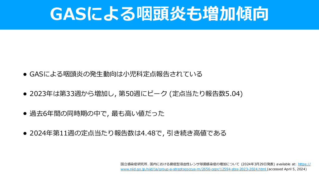 #14. GASによる咽頭炎も増加傾向 • GASによる咽頭炎の発 • 2023年は第33週から増加し, 第50週にピーク (定点当たり報告数5.04) • 過去6年間の同時期の中で, 最も • 2024年第11週の定点当たり報告数は4.48で, 引き続き 動向は 児科定点報告されている い値だった 値である 高 日 月 高 小 生 血 立 国 感染症研究所. 国内における劇症型溶 性レンサ球菌感染症の増加について (2024年3 29 発表) available at: https:// www.niid.go.jp/niid/ja/group-a-streptococcus-m/2656-cepr/12594-stss-2023-2024.html (accessed April 5, 2024)