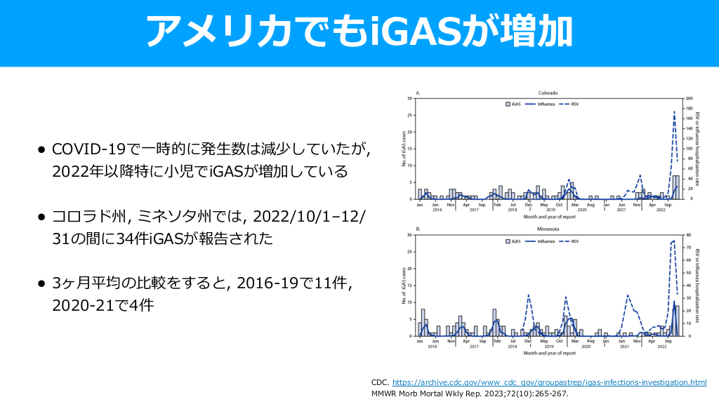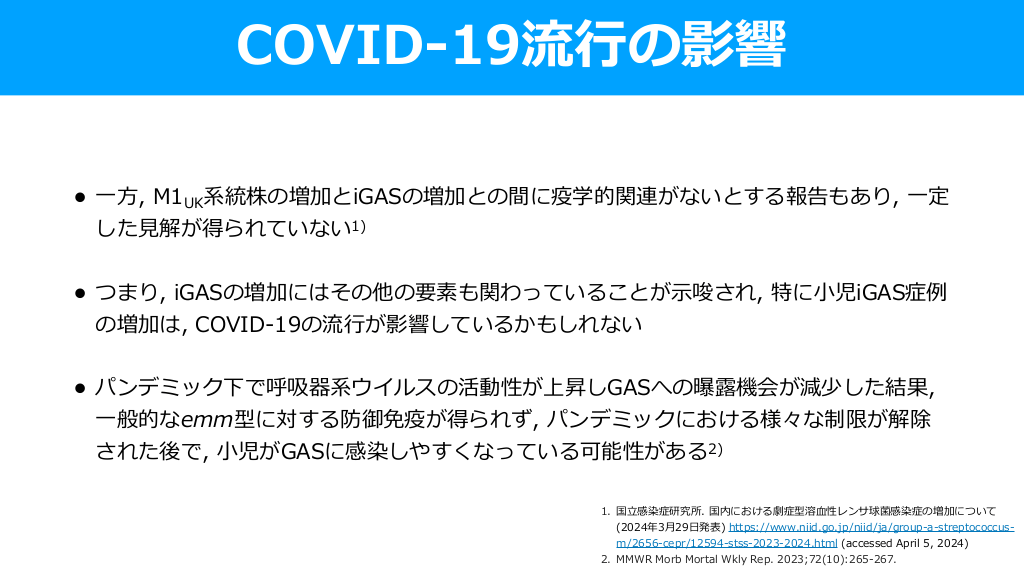 #21. • , M1UK系統株の増加とiGASの増加との間に疫学的関連がないとする報告もあり, した 解が得られていない1) • つまり, iGASの増加にはその他の要素も関わっていることが の増加は, COVID-19の流 が影響しているかもしれない • パンデミック下で呼吸器系ウイルスの活動性が上昇しGASへの曝露機会が減少した結果, 般的なemm型に対する防御免疫が得られず, パンデミックにおける様々な制限が解除 された後で, 児がGASに感染しやすくなっている可能性がある2) 唆され, 特に 定 児iGAS症例 一 小 示 行 行 血 小 日 月 見 方 1. 国 感染症研究所. 国内における劇症型溶 性レンサ球菌感染症の増加について (2024年3 29 発表) https://www.niid.go.jp/niid/ja/group-a-streptococcusm/2656-cepr/12594-stss-2023-2024.html (accessed April 5, 2024) 2. MMWR Morb Mortal Wkly Rep. 2023;72(10):265-267. 立 一 一 COVID-19流 の影響