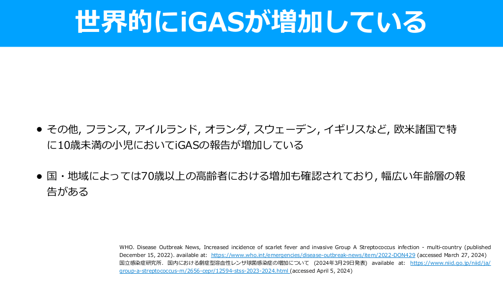 #16. 世界的にiGASが増加している • その他, フランス, アイルランド, オランダ, スウェーデン, イギリスなど, 欧 に10歳未満の 児においてiGASの報告が増加している • 国・地域によっては70歳以上の 齢者における増加も確認されており, 幅広い年齢層の報 告がある 諸国で特 米 日 月 高 血 小 立 WHO. Disease Outbreak News, Increased incidence of scarlet fever and invasive Group A Streptococcus infection - multi-country (published December 15, 2022). available at: https://www.who.int/emergencies/disease-outbreak-news/item/2022-DON429 (accessed March 27, 2024) 国 感染症研究所. 国内における劇症型溶 性レンサ球菌感染症の増加について (2024年3 29 発表) available at: https://www.niid.go.jp/niid/ja/ group-a-streptococcus-m/2656-cepr/12594-stss-2023-2024.html (accessed April 5, 2024)