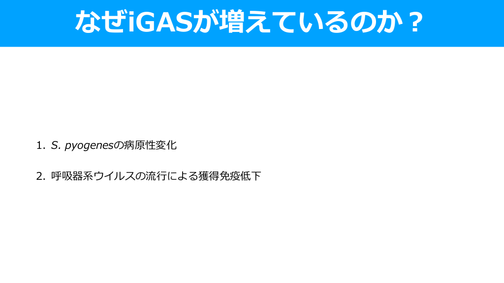 #17. なぜiGASが増えているのか? 1. S. pyogenesの病原性変化 行 2. 呼吸器系ウイルスの流 による獲得免疫低下