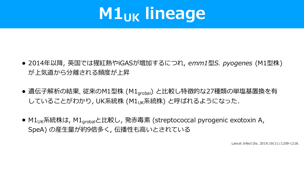 #18. M1UK lineage • 2014年以降, 英国では猩紅熱やiGASが増加するにつれ, emm1型S. pyogenes (M1型株) が上気道から分離される頻度が上昇 • 遺伝 • M1UK系統株は, M1grobalと 較し, 発 毒素 (streptococcal pyrogenic exotoxin A, SpeA) の産 量が約9倍多く, 伝播性も いとされている 解析の結果, 従来のM1型株 (M1grobal) と 較し特徴的な27種類の単塩基置換を有 していることがわかり, UK系統株 (M1UK系統株) と呼ばれるようになった. 比 高 赤 比 生 子 Lancet Infect Dis. 2019;19(11):1209-1218.