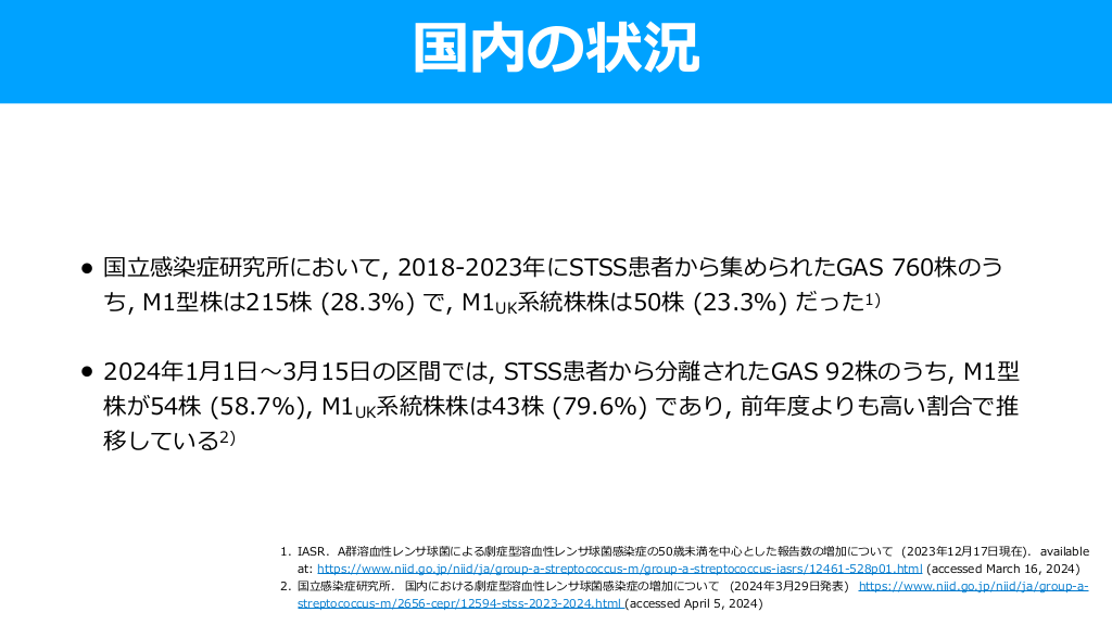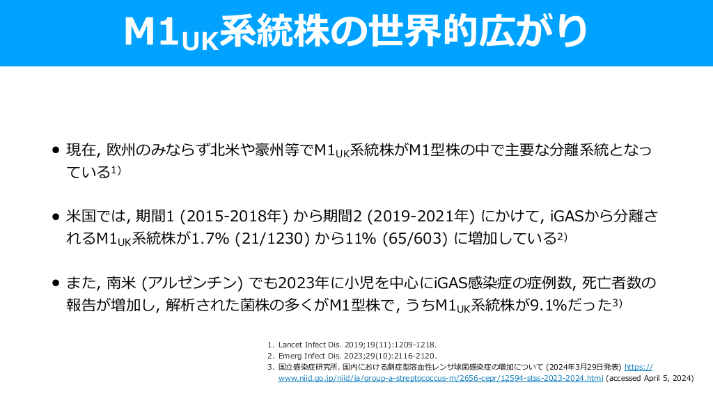 #20. • 現在, 欧州のみならず北 ている1) • 国では, 期間1 (2015-2018年) から期間2 (2019 2021年) にかけて, iGASから分離さ れるM1UK系統株が1.7% (21/1230) から11% (65/603) に増加している2) • また, 南 (アルゼンチン) でも2023年に 児を中 にiGAS感染症の症例数, 死亡者数の 報告が増加し, 解析された菌株の多くがM1型株で, うちM1UK系統株が9.1%だった3) や豪州等でM1UK系統株がM1型株の中で主要な分離系統となっ ‒ 心 日 月 小 米 血 米 1. Lancet Infect Dis. 2019;19(11):1209-1218. 2. Emerg Infect Dis. 2023;29(10):2116-2120. 3. 国 感染症研究所. 国内における劇症型溶 性レンサ球菌感染症の増加について (2024年3 29 発表) https:// www.niid.go.jp/niid/ja/group-a-streptococcus-m/2656-cepr/12594-stss-2023-2024.html (accessed April 5, 2024) 立 米 M1UK系統株の世界的広がり