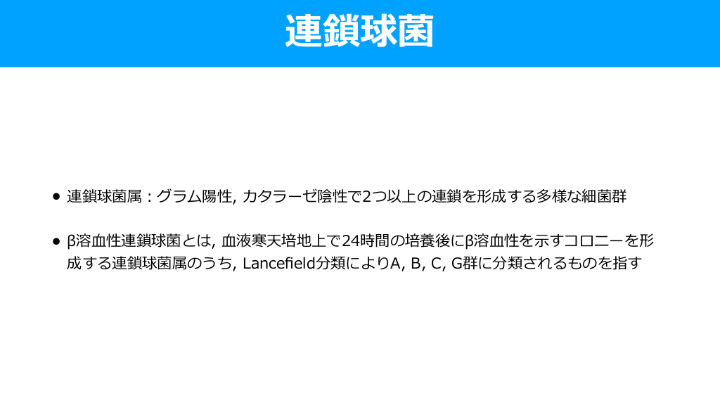 #2. β溶 性連鎖球菌とは, 液寒天培地上で24時間の培養後にβ溶 性を すコロニーを形 成する連鎖球菌属のうち, Lance eld分類によりA, B, C, G群に分類されるものを指す 示 • 血 連鎖球菌属:グラム陽性, カタラーゼ陰性で2つ以上の連鎖を形成する多様な細菌群 fi • 血 血 連鎖球菌