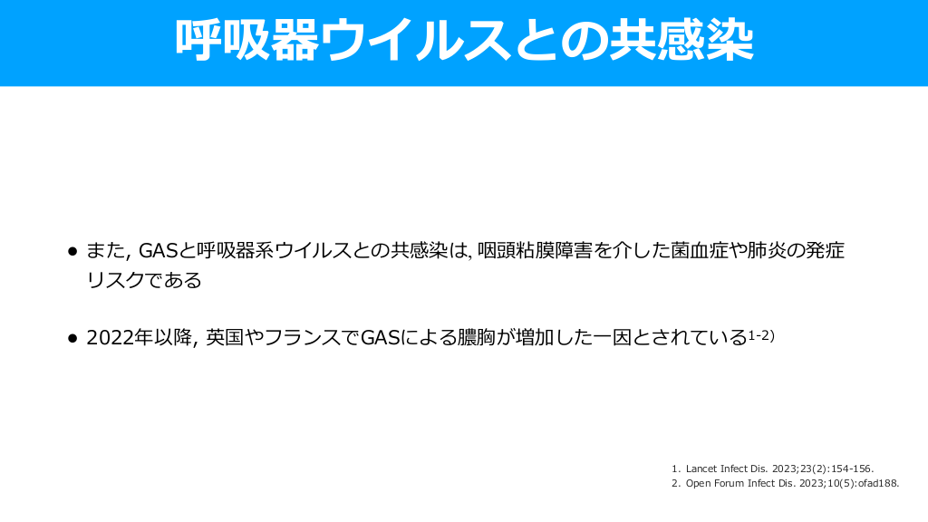 #22. 呼吸器ウイルスとの共感染 • また, GASと呼吸器系ウイルスとの共感染は, 咽頭粘膜障害を介した菌 症や肺炎の発症 • 2022年以降, 英国やフランスでGASによる膿胸が増加した リスクである 因とされている1-2) 血 一 1. Lancet Infect Dis. 2023;23(2):154-156. 2. Open Forum Infect Dis. 2023;10(5):ofad188.