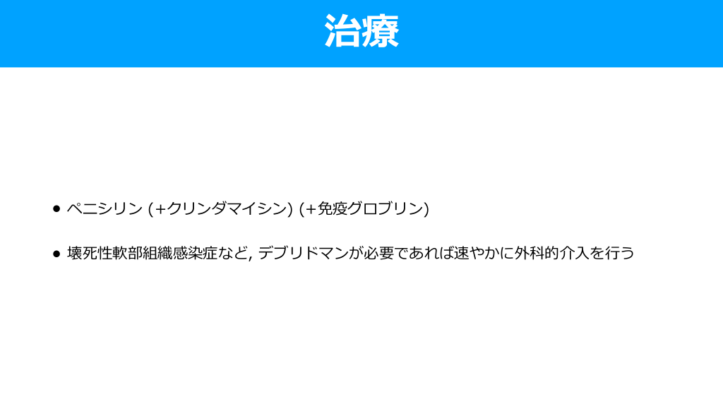 #23. 治療 • 壊死性軟部組織感染症など, デブリドマンが必要であれば速やかに外科的介 行 ペニシリン (+クリンダマイシン) (+免疫グロブリン) 入 • を う