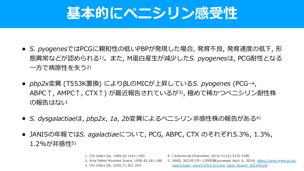 #24. • S. pyogenesではPCGに親和性の低いPBPが発現した場合, 発育不良, 発育速度の低下, 形 態異常などが認められる1)。また, M蛋 産 が減少したS. pyogenesは, PCG耐性となる で病原性を失う2) • pbp2x変異 (T553K置換) によりβLのMICが上昇しているS. pyogenes (PCG→, ABPC↑, AMPC↑, CTX↑) が最近報告されているが3), 極めて稀かつペニシリン耐性株 の報告はない • S. dysgalactiaeは, pbp2x, 1a, 2b変異によるペニシリン 感性株の報告がある4) • JANISの年報ではS. agalactiaeについて, PCG, ABPC, CTX のそれぞれ5.3%, 1.3%, 1.2%が 感性5) 4. J Antimicrob Chemother. 2016;71(12):3376-3380. 5. JANIS 2021年1 12 年報(accessed April 6, 2024) https://janis.mhlw.go.jp/ report/open_report/2021/3/1/ken_Open_Report_202100.pdf 非 生 白 月 ~ 月 非 1. Clin Infect Dis. 1998;26:1341-1345. 2. Acta Pathol Microbiol Scand. 1958;42:181-188. 3. Clin Infect Dis. 2020;71:201-204. 方 一 基本的にペニシリン感受性