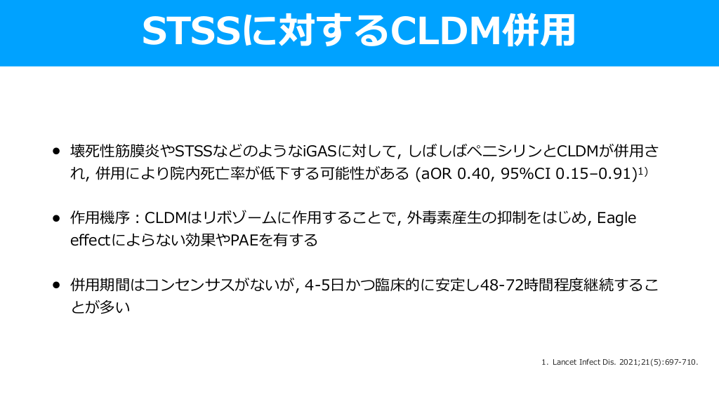 #25. STSSに対するCLDM併 • 壊死性筋膜炎やSTSSなどのようなiGASに対して, しばしばペニシリンとCLDMが併 さ れ, 併 により院内死亡率が低下する可能性がある (aOR 0.40, 95%CI 0.15–0.91)1) • 作 機序:CLDMはリボゾームに作 することで, 外毒素産 e ectによらない効果やPAEを有する • 併 期間はコンセンサスがないが, 4-5 とが多い の抑制をはじめ, Eagle かつ臨床的に安定し48-72時間程度継続するこ 用 用 生 日 用 用 用 用 ff 1. Lancet Infect Dis. 2021;21(5):697-710.