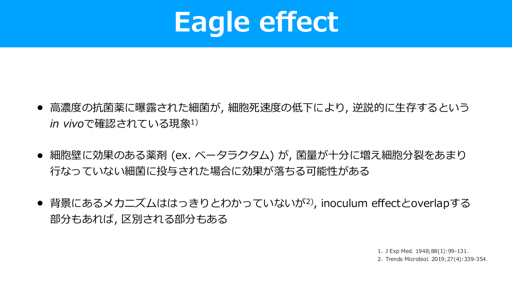 #26. • 濃度の抗菌薬に曝露された細菌が, 細胞死速度の低下により, 逆説的に in vivoで確認されている現象1) • 細胞壁に効果のある薬剤 (ex. ベータラクタム) が, 菌量が 分に増え細胞分裂をあまり なっていない細菌に投与された場合に効果が落ちる可能性がある • 背景にあるメカニズムははっきりとわかっていないが2), inoculum e ectとoverlapする 部分もあれば, 区別される部分もある 存するという 生 ff 十 1. J Exp Med. 1948;88(1):99-131. 2. Trends Microbiol. 2019;27(4):339-354. ff 高 行 Eagle e ect