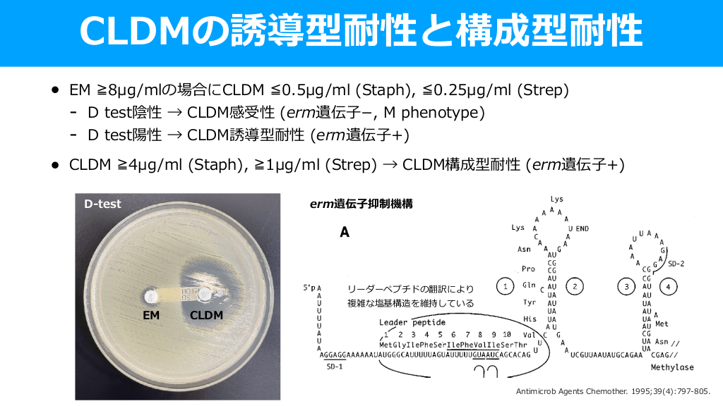 #27. CLDMの誘導型耐性と構成型耐性 • EM ≧8μg/mlの場合にCLDM ≦0.5μg/ml (Staph), ≦0.25μg/ml (Strep) - D test陰性 → CLDM感受性 (erm遺伝 , M phenotype) - D test陽性 → CLDM誘導型耐性 (erm遺伝 +) • CLDM ≧4μg/ml (Staph), ≧1μg/ml (Strep) → CLDM構成型耐性 (erm遺伝 D-test erm遺伝 EM +) 抑制機構 リーダーペプチドの翻訳により 複雑な塩基構造を維持している CLDM 子 子 − 子 子 Antimicrob Agents Chemother. 1995;39(4):797-805.