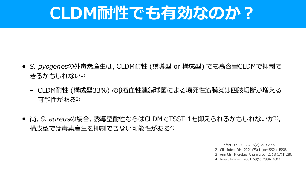 #28. CLDM耐性でも有効なのか? S. pyogenesの外毒素産 きるかもしれない1) - 容量CLDMで抑制で 尚, S. aureusの場合, 誘導型耐性ならばCLDMでTSST-1を抑えられるかもしれないが3), 構成型では毒素産 を抑制できない可能性がある4) 高 血 1. 2. 3. 4. 生 • は, CLDM耐性 (誘導型 or 構成型) でも CLDM耐性 (構成型33%) のβ溶 性連鎖球菌による壊死性筋膜炎は四肢切断が増える 可能性がある2) 生 • J Infect Dis. 2017;215(2):269-277. Clin Infect Dis. 2021;73(11):e4592-e4598. Ann Clin Microbiol Antimicrob. 2018;17(1):38. Infect Immun. 2001;69(5):2996-3003.