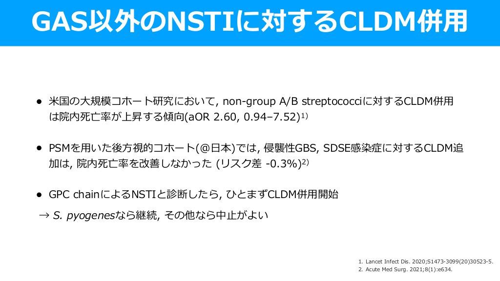 #29. • 国の 規模コホート研究において, non-group A/B streptococciに対するCLDM併 は院内死亡率が上昇する傾向(aOR 2.60, 0.94–7.52)1) • PSMを いた後 視的コホート(@ 本)では, 侵襲性GBS, SDSE感染症に対するCLDM追 加は, 院内死亡率を改善しなかった (リスク差 -0.3%)2) • GPC chainによるNSTIと診断したら, ひとまずCLDM併 → S. pyogenesなら継続, その他なら中 開始 がよい 用 用 用 止 日 方 大 1. Lancet Infect Dis. 2020;S1473-3099(20)30523-5. 2. Acute Med Surg. 2021;8(1):e634. 用 米 GAS以外のNSTIに対するCLDM併