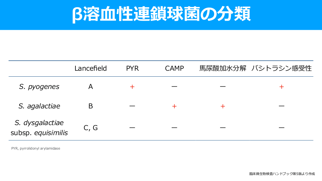 #3. 性連鎖球菌の分類 Lance eld PYR CAMP 尿酸加 分解 バシトラシン感受性 S. pyogenes A + ー ー + S. agalactiae B ー + + ー S. dysgalactiae subsp. equisimilis C, G ー ー ー ー PYR, pyrrolidonyl arylamidase 血 水 fi 臨床微 生 馬 β溶 物検査ハンドブック第5版より作成