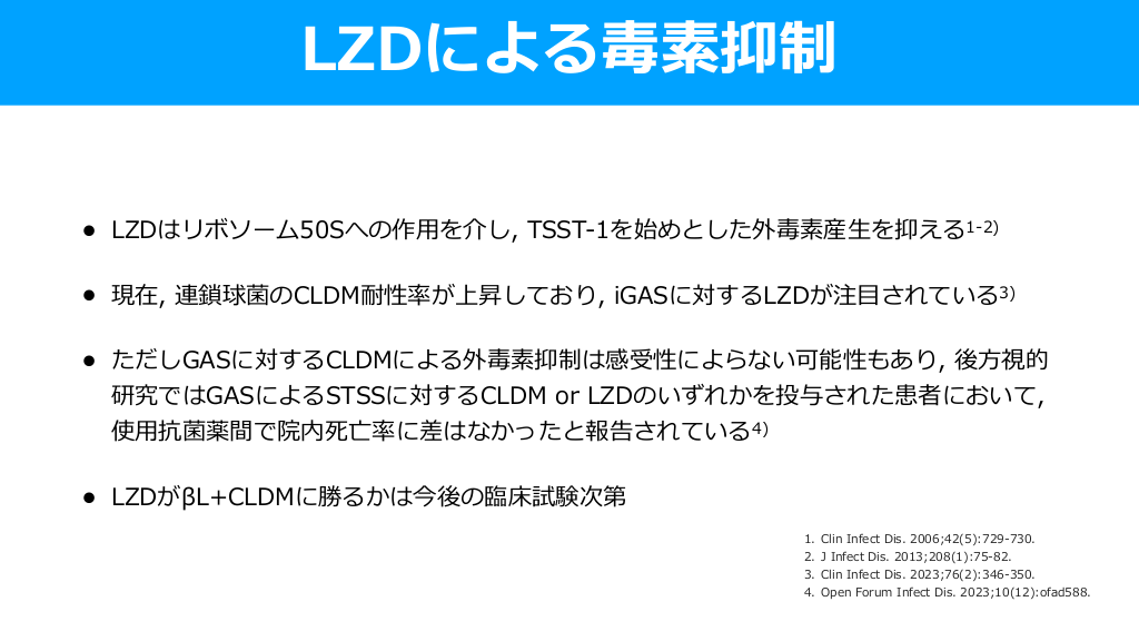 #30. LZDによる毒素抑制 • LZDはリボソーム50Sへの作 • 現在, 連鎖球菌のCLDM耐性率が上昇しており, iGASに対するLZDが注 • ただしGASに対するCLDMによる外毒素抑制は感受性によらない可能性もあり, 後 視的 研究ではGASによるSTSSに対するCLDM or LZDのいずれかを投与された患者において, 使 抗菌薬間で院内死亡率に差はなかったと報告されている4) • LZDがβL+CLDMに勝るかは今後の臨床試験次第 を介し, TSST-1を始めとした外毒素産 を抑える1-2) されている3) 1. Clin Infect Dis. 2006;42(5):729-730. 2. J Infect Dis. 2013;208(1):75-82. 3. Clin Infect Dis. 2023;76(2):346-350. 方 目 生 用 用 4. Open Forum Infect Dis. 2023;10(12):ofad588.