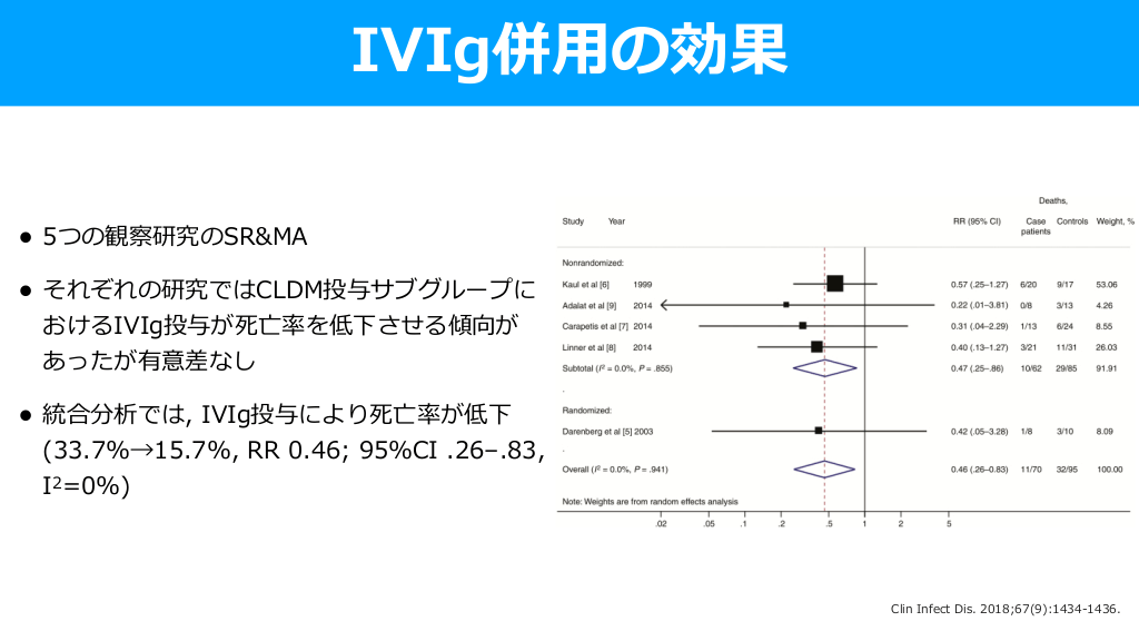#31. IVIg併 の効果 • 5つの観察研究のSR&MA • それぞれの研究ではCLDM投与サブグループに おけるIVIg投与が死亡率を低下させる傾向が あったが有意差なし • 統合分析では, IVIg投与により死亡率が低下 (33.7%→15.7%, RR 0.46; 95%CI .26–.83, I2=0%) 用 Clin Infect Dis. 2018;67(9):1434-1436.