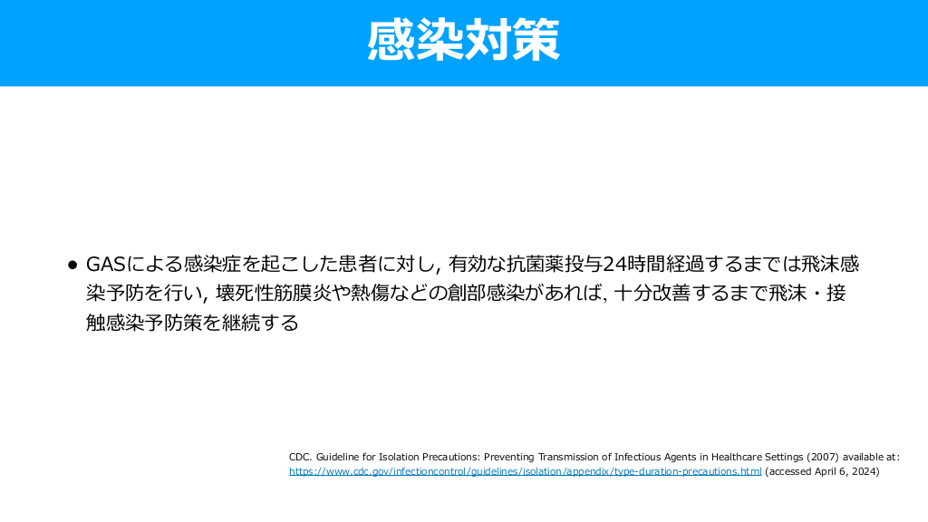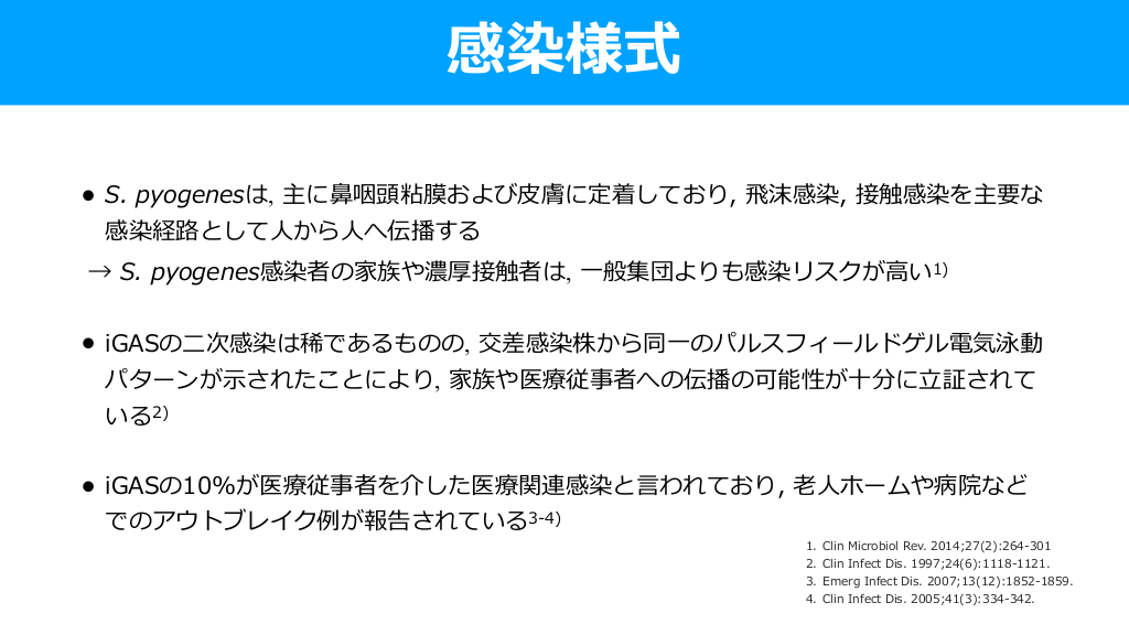 #32. 感染様式 • S. pyogenesは, 主に 感染経路として から 咽頭粘膜および 膚に定着しており, へ伝播する → S. pyogenes感染者の家族や濃厚接触者は, • iGASの 般集団よりも感染リスクが い1) 次感染は稀であるものの, 交差感染株から同 パターンが 沫感染, 接触感染を主要な のパルスフィールドゲル電気泳動 されたことにより, 家族や医療従事者への伝播の可能性が 分に 証されて いる2) われており, ホームや病院など 立 高 十 人 老 1. 2. 3. 4. 飛 一 言 一 皮 人 鼻 人 iGASの10%が医療従事者を介した医療関連感染と でのアウトブレイク例が報告されている3-4) 示 二 • Clin Microbiol Rev. 2014;27(2):264-301 Clin Infect Dis. 1997;24(6):1118-1121. Emerg Infect Dis. 2007;13(12):1852-1859. Clin Infect Dis. 2005;41(3):334-342.