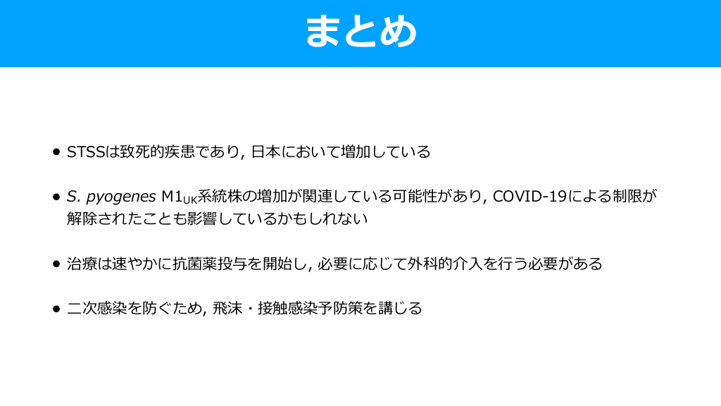 #34. • STSSは致死的疾患であり, • S. pyogenes M1UK系統株の増加が関連している可能性があり, COVID-19による制限が 解除されたことも影響しているかもしれない • 治療は速やかに抗菌薬投与を開始し, 必要に応じて外科的介 本において増加している 行 沫・接触感染予防策を講じる 入 次感染を防ぐため, 日 • 飛 二 まとめ を う必要がある