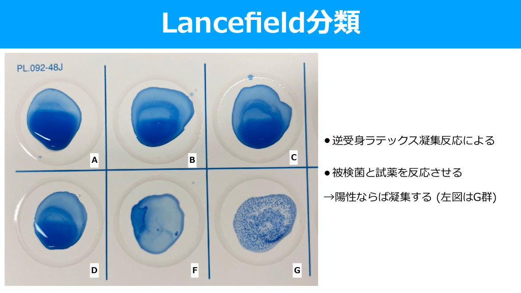 #4. Lance eld分類 • 逆受 A B C ラテックス凝集反応による • 被検菌と試薬を反応させる →陽性ならば凝集する (左図はG群) fi 身 D F G
