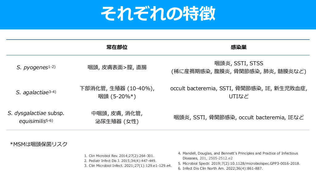 #5. それぞれの特徴 常在部位 S. pyogenes1-2) 咽頭, 膚表 >膣, 直腸 S. agalactiae3-4) 下部消化管, 殖器 (10-40%), 咽頭 (5-20%*) S. dysgalactiae subsp. equisimilis5-6) 中咽頭, 膚, 消化管, 泌尿 殖器 ( 性) 感染巣 咽頭炎, SSTI, STSS (稀に産褥期感染, 腹膜炎, 関節感染, 肺炎, 髄膜炎など) occult bacteremia, SSTI, 関節感染, IE, 新 UTIなど 咽頭炎, SSTI, 児敗 関節感染, occult bacteremia, IEなど *MSMは咽頭保菌リスク 1. Clin Microbiol Rev. 2014;27(2):264-301. 2. Pediatr Infect Dis J. 2015;34(4):447-449. 血 生 骨 骨 骨 女 面 生 皮 皮 生 3. Clin Microbiol Infect. 2021;27(1):129.e1-129.e4. 症, 4. Mandell, Douglas, and Bennett's Principles and Practice of Infectious Diseases, 201, 2505-2512.e2 5. Microbiol Spectr. 2019;7(2):10.1128/microbiolspec.GPP3-0016-2018. 6. Infect Dis Clin North Am. 2022;36(4):861-887.