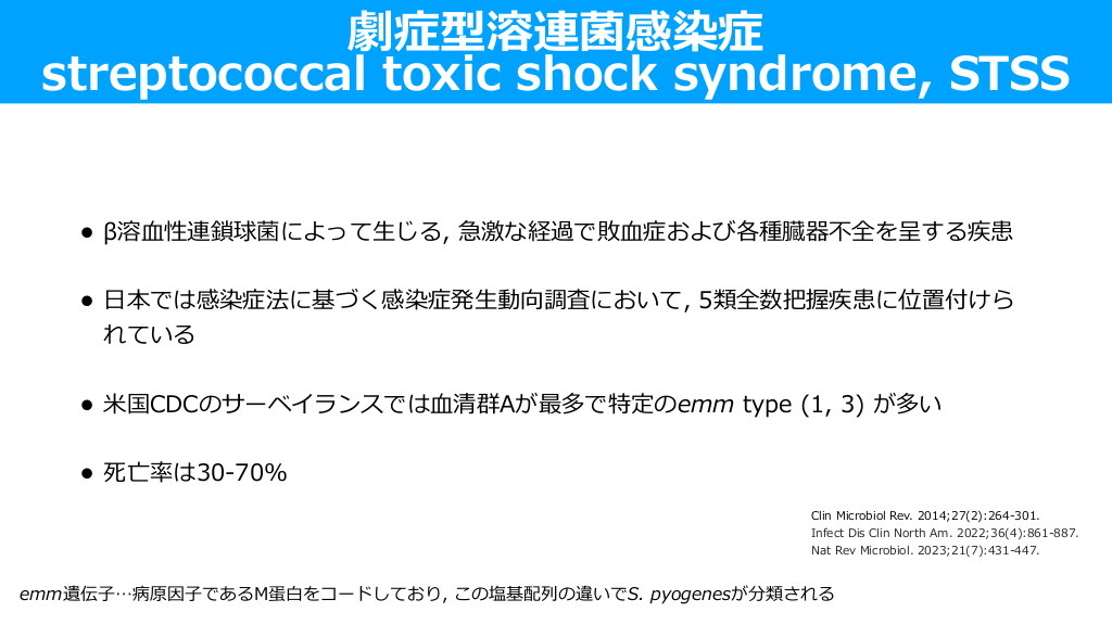 #6. • β溶 性連鎖球菌によって • 本では感染症法に基づく感染症発 れている • • じる, 急激な経過で敗 症および各種臓器不全を呈する疾患 動向調査において, 5類全数把握疾患に位置付けら 国CDCのサーベイランスでは 清群Aが最多で特定のemm type (1, 3) が多い 死亡率は30-70% Clin Microbiol Rev. 2014;27(2):264-301. Infect Dis Clin North Am. 2022;36(4):861-887. Nat Rev Microbiol. 2023;21(7):431-447. 血 生 血 生 白 子 子 emm遺伝 …病原因 であるM蛋 をコードしており, この塩基配列の違いでS. pyogenesが分類される 血 日 米 劇症型溶連菌感染症 streptococcal toxic shock syndrome, STSS