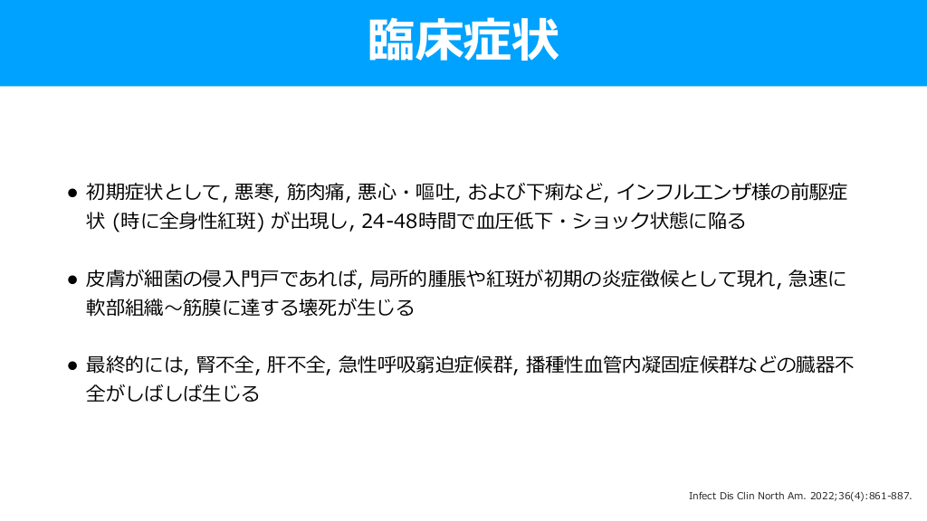 #7. • 初期症状として, 悪寒, 筋 痛, 悪 ・嘔吐, および下痢など, インフルエンザ様の前駆症 状 (時に全 性紅斑) が出現し, 24-48時間で 圧低下・ショック状態に陥る • 膚が細菌の侵 であれば, 局所的腫脹や紅斑が初期の炎症徴候として現れ, 急速に 軟部組織〜筋膜に達する壊死が じる • 最終的には, 腎不全, 肝不全, 急性呼吸窮迫症候群, 播種性 全がしばしば じる 管内凝固症候群などの臓器不 血 血 心 生 肉 戸 門 入 生 Infect Dis Clin North Am. 2022;36(4):861-887. 身 皮 臨床症状