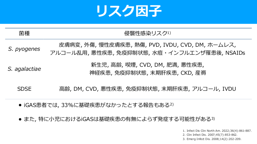 #8. 菌種 侵襲性感染リスク1) S. pyogenes 膚病変, 外傷, 慢性 膚疾患, 熱傷, PVD, IVDU, CVD, DM, ホームレス, アルコール乱 , 悪性疾患, 免疫抑制状態, 痘・インフルエンザ罹患後, NSAIDs S. agalactiae 新 児, 齢, 喫煙, CVD, DM, 肥満, 悪性疾患, 神経疾患, 免疫抑制状態, 末期肝疾患, CKD, 産褥 SDSE 齢, DM, CVD, 悪性疾患, 免疫抑制状態, 末期肝疾患, アルコール, IVDU • iGAS患者では, 33%に基礎疾患がなかったとする報告もある2) • また, 特に 児におけるiGASは基礎疾患の有無によらず発症する可能性がある3) 水 子 皮 用 小 高 1. Infect Dis Clin North Am. 2022;36(4):861-887. 2. Clin Infect Dis. 2007;45(7):853-862. 3. Emerg Infect Dis. 2008;14(2):202-209. 生 皮 高 リスク因