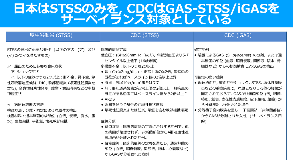 #9. 厚 労働省 (STSS) STSSの届出に必要な要件 (以下のアの (ア) 及び (イ) かつイを満たすもの) ア 届出のために必要な臨床症状 ア. ショック症状 イ. 以下の症状のうち2つ以上:肝不全、腎不全, 急 性呼吸窮迫症候群, DIC, 軟部組織炎 (壊死性筋膜炎を 含む), 全 性紅斑性発疹, 痙攣・意識消失などの中枢 神経症状 水 目 骨 血 水 血 心 非 水 血 皮 皮 人 子 非 女 非 皮 方 手 血 血 身 身 高 血 子 血 方 生 生 イ 病原体診断の 法 検査 法:分離・同定による病原体の検出 検査材料:通常無菌的な部位 ( 液, 髄液, 胸 , 腹 ), 検組織, 術創, 壊死軟部組織 血 日 水 母 本はSTSSのみを, CDCはGAS-STSS/iGASを サーベイランス対象としている CDC (STSS) CDC (iGAS) 臨床的症例定義 低 圧:sBP≦90mmHg (成 ), 年齢別 圧より5パ ーセンタイル以上低下 (16歳未満) 多臓器不全:以下のうち2つ以上 • 腎:Cre≧2mg/dL, or 正常上限の≧2倍, 腎疾患の 既往があればベースライン値の2倍以上上昇 • 凝固:Plt≦10万/mm3またはDIC • 肝:肝胆道系酵素が正常上限の2倍以上, 肝疾患の 既往がある患者ではベースライン値から2倍以上↑ • ARDS • 落屑を伴う全 性の紅斑性斑状 疹 • 壊死性筋膜炎または筋炎, 壊疽を含む軟部組織壊死 確定症例 • 培養によるGAS (S. pyogenes) の分離, または通 常無菌の部位 ( 液, 脳脊髄液, 関節液, 腹 , , 臓器など) からの核酸検査によるGASの検出 症例分類 • 疑似症例:臨床的症例の定義に合致する症例で, 他 の病因が確認されず、 滅菌部位からA群溶 性連 鎖球菌が分離された症例。 • 確定症例:臨床的症例の定義を満たし, 通常無菌の 部位 ( 液, 脳脊髄液, 関節液, 胸 , 嚢液など) からGASが分離された症例 可能性の い症例 • 体敗 症, 敗 症性ショック, STSS, 壊死性筋膜 炎などの重症疾患で, 病原となりうる他の細菌が 同定されておらず, GASが 無菌
