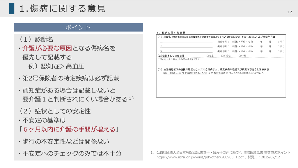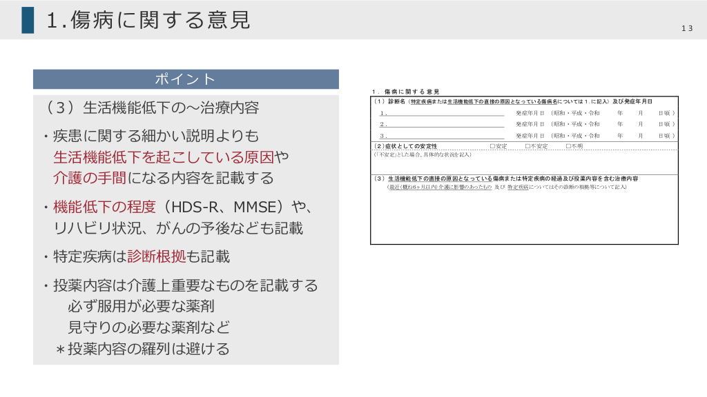 #12. 1.傷病に関する意⾒ ポイント (1)診断名 ・介護が必要な原因となる傷病名を 優先して記載する 例)認知症>⾼⾎圧 ・第2号保険者の特定疾病は必ず記載 ・認知症がある場合は記載しないと 要介護1と判断されにくい場合がある1) (2)症状としての安定性 ・不安定の基準は 「6ヶ⽉以内に介護の⼿間が増える」 ・歩⾏の不安定性などは関係ない ・不安定へのチェックのみでは不⼗分 医 師 氏 名 医 療 機 関 名 医療機関所在地 月 ( ) FAX ( ) 12 (1) 最 終 診 察 日 令和 (2) 意見書作成回数 □初回 □2回目以上 □有 □無 (有の場合)→□内科 □精神科 □外科 □整形外科 □脳神経外科 □皮膚科 □泌尿器科 □婦人科 □眼科 □耳鼻咽喉科 □リハビリテーション科 □歯科 □その他( ) (3) 他科受診の有無 年 電話 日 1.傷病に関する意見 (1) 診断名(特定疾病または生活機能低下の直接の原因となっている傷病名については1.に記入)及び発症年月日 1. 発症年月日 (昭和・平成・令和 年 月 日頃 ) 2. 発症年月日 (昭和・平成・令和 年 月 日頃 ) 3. 発症年月日 (昭和・平成・令和 年 月 日頃 ) (2)症状としての安定性 □安定 □不安定 □不明 (「不安定」とした場合、具体的な状況を記入) (3) 生活機能低下の直接の原因となっている傷病または特定疾病の経過及び投薬内容を含む治療内容 (最近(概ね6ヶ月以内)介護に影響のあったもの 及び 特定疾病についてはその診断の根拠等について記入) 2 . 特 別 な 医 療 ( 過去 14 日間以内に受けた医療のすべてにチェック) 処置内容 特別な対応 失禁への対応 □点滴の管理 □中心静脈栄養 □透析 □ストーマの処置 □レスピレーター □気管切開の処置 □疼痛の看護 □経管栄養 □モニター測定(血圧、心拍、酸素飽和度等) □褥瘡の処置 □カテーテル(コンドームカテーテル、留置カテーテル 等) □酸素療法 3.心身の状態に関する意見 (1) 日常生活の自立度等について ・障害高齢者の日常生活自立度(寝たきり度) □自立 □J1 □J2 □A1 □A2 □B1 □B2 □C1 □C2 ・認