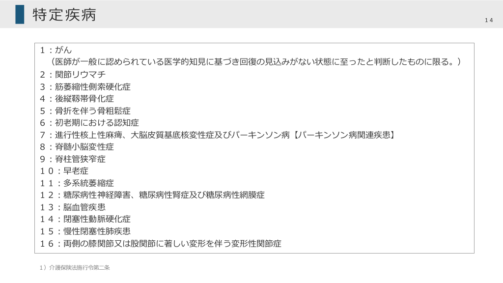 #14. 特定疾病 1︓がん (医師が⼀般に認められている医学的知⾒に基づき回復の⾒込みがない状態に⾄ったと判断したものに限る。) 2︓関節リウマチ 3︓筋萎縮性側索硬化症 4︓後縦靱帯⾻化症 5︓⾻折を伴う⾻粗鬆症 6︓初⽼期における認知症 7︓進⾏性核上性⿇痺、⼤脳⽪質基底核変性症及びパーキンソン病【パーキンソン病関連疾患】 8︓脊髄⼩脳変性症 9︓脊柱管狭窄症 10︓早⽼症 11︓多系統萎縮症 12︓糖尿病性神経障害、糖尿病性腎症及び糖尿病性網膜症 13︓脳⾎管疾患 14︓閉塞性動脈硬化症 15︓慢性閉塞性肺疾患 16︓両側の膝関節⼜は股関節に著しい変形を伴う変形性関節症 1)介護保険法施⾏令第⼆条 14