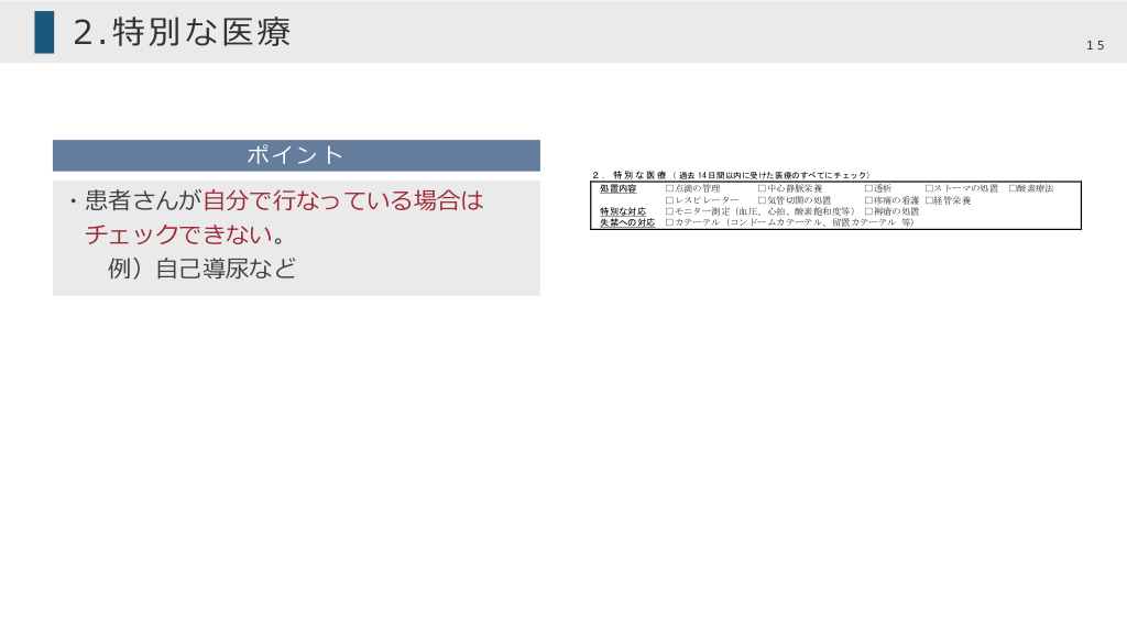 #15. 2.特別な医療 (2)症状としての安定性 □安定 □不安定 □不明 (「不安定」とした場合、具体的な状況を記入) 15 (3) 生活機能低下の直接の原因となっている傷病または特定疾病の経過及び投薬内容を含む治療内容 (最近(概ね6ヶ月以内)介護に影響のあったもの 及び 特定疾病についてはその診断の根拠等について記入) ポイント ・患者さんが⾃分で⾏なっている場合は チェックできない。 例)⾃⼰導尿など 2 . 特 別 な 医 療 ( 過去 14 日間以内に受けた医療のすべてにチェック) 処置内容 特別な対応 失禁への対応 □点滴の管理 □中心静脈栄養 □透析 □ストーマの処置 □レスピレーター □気管切開の処置 □疼痛の看護 □経管栄養 □モニター測定(血圧、心拍、酸素飽和度等) □褥瘡の処置 □カテーテル(コンドームカテーテル、留置カテーテル 等) □酸素療法 3.心身の状態に関する意見 (1) 日常生活の自立度等について ・障害高齢者の日常生活自立度(寝たきり度) □自立 □J1 □J2 □A1 □A2 □B1 □B2 □C1 □C2 ・認知症高齢者の日常生活自立度 □自立 □Ⅰ □Ⅱa □Ⅱb □Ⅲa □Ⅲb □Ⅳ □M (2) 認知症の中核症状(認知症以外の疾患で同様の症状を認める場合を含む) ・短期記憶 □問題なし □問題あり ・日常の意思決定を行うための認知能力 □自立 □いくらか困難 □見守りが必要 □判断できない ・自分の意思の伝達能力 □伝えられる □いくらか困難 □具体的要求に限られる □伝えられない (3) 認知症の行動・心理症状(BPSD) (該当する項目全てチェック:認知症以外の疾患で同様の症状を認める場合を含む) □無 □有 □幻視・幻聴 □妄想 □昼夜逆転 □暴言 □暴行 □介護への抵抗 □徘徊 □火の不始末 □不潔行為 □異食行動 □性的問題行動 □その他( ) (4) その他の精神・神経症状 □無 □有 症状名: 〔専門医受診の有無 □有 ( 科)□無〕 10