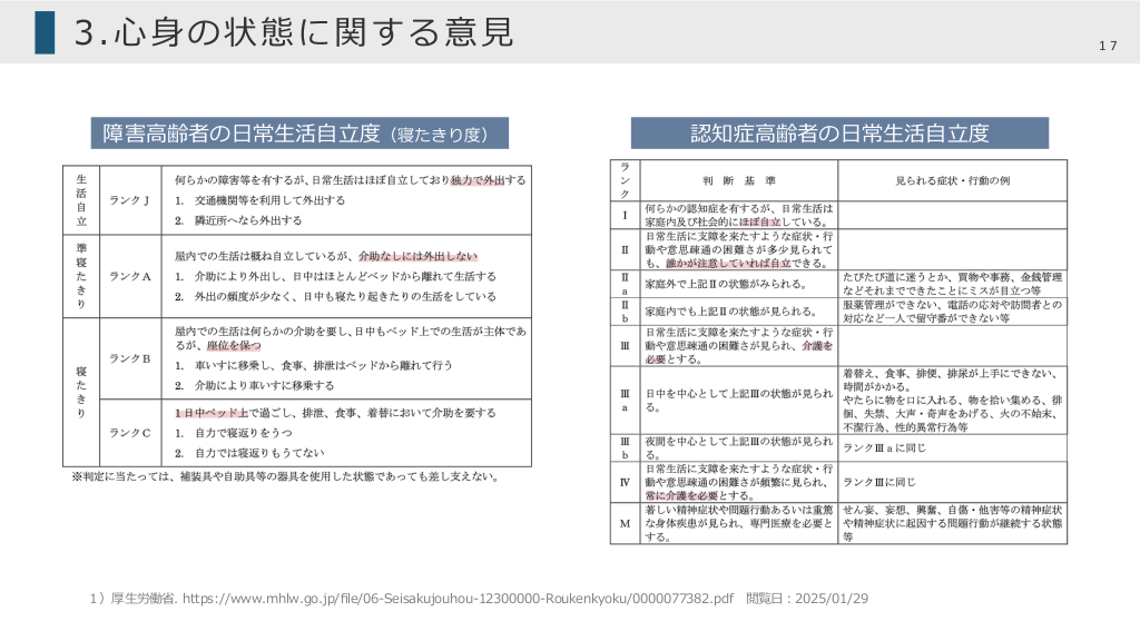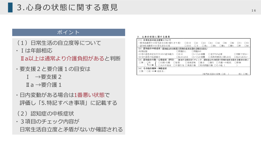 #16. 3.⼼⾝の状態に関する意⾒ 16 2 . 特 別 な 医 療 ( 過去 14 日間以内に受けた医療のすべてにチェック) 処置内容 ポイント (1)⽇常⽣活の⾃⽴度等について ・Ⅰは年齢相応 Ⅱa以上は通常より介護負担があると判断 ・要⽀援2と要介護1の⽬安は Ⅰ →要⽀援2 Ⅱa →要介護1 ・⽇内変動がある場合は1番悪い状態で 評価し「5.特記すべき事項」に記載する (2)認知症の中核症状 ・3項⽬のチェック内容が ⽇常⽣活⾃⽴度と⽭盾がないか確認される 特別な対応 失禁への対応 □点滴の管理 □中心静脈栄養 □透析 □ストーマの処置 □レスピレーター □気管切開の処置 □疼痛の看護 □経管栄養 □モニター測定(血圧、心拍、酸素飽和度等) □褥瘡の処置 □カテーテル(コンドームカテーテル、留置カテーテル 等) □酸素療法 3.心身の状態に関する意見 (1) 日常生活の自立度等について ・障害高齢者の日常生活自立度(寝たきり度) □自立 □J1 □J2 □A1 □A2 □B1 □B2 □C1 □C2 ・認知症高齢者の日常生活自立度 □自立 □Ⅰ □Ⅱa □Ⅱb □Ⅲa □Ⅲb □Ⅳ □M (2) 認知症の中核症状(認知症以外の疾患で同様の症状を認める場合を含む) ・短期記憶 □問題なし □問題あり ・日常の意思決定を行うための認知能力 □自立 □いくらか困難 □見守りが必要 □判断できない ・自分の意思の伝達能力 □伝えられる □いくらか困難 □具体的要求に限られる □伝えられない (3) 認知症の行動・心理症状(BPSD) (該当する項目全てチェック:認知症以外の疾患で同様の症状を認める場合を含む) □無 □有 □幻視・幻聴 □妄想 □昼夜逆転 □暴言 □暴行 □介護への抵抗 □徘徊 □火の不始末 □不潔行為 □異食行動 □性的問題行動 □その他( ) (4) その他の精神・神経症状 □無 □有 症状名: 〔専門医受診の有無 □有 ( 科)□無〕 10