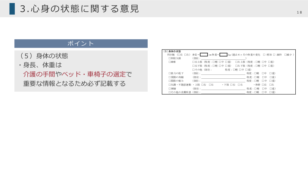 #18. 3.⼼⾝の状態に関する意⾒ 18 ポイント (5)⾝体の状態 ・⾝⻑、体重は 介護の⼿間やベッド・⾞椅⼦の選定で 重要な情報となるため必ず記載する (5)身体の状態 利き腕 (□右 □左) 身長= □四肢欠損 (部位: □麻痺 cm 体重= kg(過去6ヶ月の体重の変化 ) □ 増加 □ 維持 □右上肢(程度:□軽 □中 □重) □左上肢(程度:□軽 □中 □重) □右下肢(程度:□軽 □中 □重) □左下肢(程度:□軽 □中 □重) □その他(部位: 程度:□軽 □中 □重) □筋力の低下 (部位: 程度:□軽 □中 □ 関節の拘縮 (部位: 程度:□軽 □中 □重) □関節の痛み (部位: 程度:□軽 □中 □重) □失調・不随意運動 ・上肢 □右 □左 □ 褥瘡 □減少 ) ・下肢 □右 □左 ・体幹 □右 □重) □左 (部位: 程度:□軽 □中 □重) □その他の皮膚疾患(部位: 程度:□軽 □中 □重) 4.生活機能とサービスに関する意見 (1)移動 屋外歩行 □自立 □介助があればしている □していない 車いすの使用 □用いていない □主に自分で操作している □主に他人が操作している 歩行補助具・装具の使用(複数選択可) □用いていない □屋外で使用 □屋内で使用 (2)栄養・食生活 食事行為 □自立ないし何とか自分で食べられる □全面介助 現在の栄養状態 □良好 □不良 → 栄養・食生活上の留意点( ) (3) 現在あるかまたは今後発生の可能性の高い状態とその対処方針 □尿失禁 □転倒・骨折 □移動能力の低下 □褥瘡 □心肺機能の低下 □閉じこもり □意欲低下 □徘徊 □低栄養 □摂食・嚥下機能低下 □脱水 □易感染性 □がん等による疼痛 □その他( ) → 対処方針 ( ) (4)サービス利用による生活機能の維持・改善の見通し □期待できる □期待できない □不明 (5) 医学的管理の必要性(特に必要性の高いものには下線を引いて下さい。予防給付により提供されるサービスを含みます。) □訪問診療 □訪問看護 □訪問歯科診療 □訪問薬剤管理指導 □訪問リハビリテーション □短期入所療養介護 □訪問歯科衛生指導 □訪問栄養食事指導 □通所リハビリテーション □老人保健施設