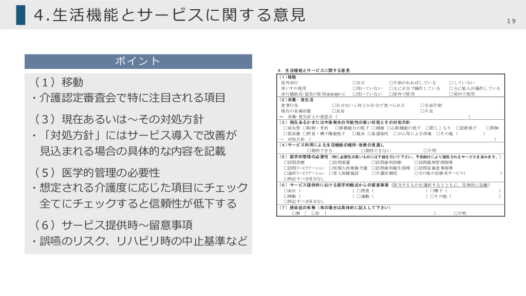 #13. 上記の申請者に関する意見は以下の通りです。 1.傷病に関する意⾒ ポイント (3)⽣活機能低下の〜治療内容 ・疾患に関する細かい説明よりも ⽣活機能低下を起こしている原因や 介護の⼿間になる内容を記載する 主治医として、本意見書が介護サービス計画作成等に利用されることに 医 師 氏 名 医 療 機 関 名 医療機関所在地 月 □同意しない。 電話 ( ) FAX ( ) 13 (1) 最 終 診 察 日 令和 (2) 意見書作成回数 □初回 □2回目以上 □有 □無 (有の場合)→□内科 □精神科 □外科 □整形外科 □脳神経外科 □皮膚科 □泌尿器科 □婦人科 □眼科 □耳鼻咽喉科 □リハビリテーション科 □歯科 □その他( ) (3) 他科受診の有無 年 □同意する。 日 1.傷病に関する意見 (1) 診断名(特定疾病または生活機能低下の直接の原因となっている傷病名については1.に記入)及び発症年月日 1. 発症年月日 (昭和・平成・令和 年 月 日頃 ) 2. 発症年月日 (昭和・平成・令和 年 月 日頃 ) 3. 発症年月日 (昭和・平成・令和 年 月 日頃 ) (2)症状としての安定性 □安定 □不安定 □不明 (「不安定」とした場合、具体的な状況を記入) (3) 生活機能低下の直接の原因となっている傷病または特定疾病の経過及び投薬内容を含む治療内容 (最近(概ね6ヶ月以内)介護に影響のあったもの 及び 特定疾病についてはその診断の根拠等について記入) ・機能低下の程度(HDS-R、MMSE)や、 リハビリ状況、がんの予後なども記載 ・特定疾病は診断根拠も記載 ・投薬内容は介護上重要なものを記載する 必ず服⽤が必要な薬剤 ⾒守りの必要な薬剤など *投薬内容の羅列は避ける 2 . 特 別 な 医 療 ( 過去 14 日間以内に受けた医療のすべてにチェック) 処置内容 特別な対応 失禁への対応 □点滴の管理 □中心静脈栄養 □透析 □ストーマの処置 □レスピレーター □気管切開の処置 □疼痛の看護 □経管栄養 □モニター測定(血圧、心拍、酸素飽和度等) □褥瘡の処置 □カテーテル(コンドームカテーテル、留置カテーテル 等) □酸素療法 3.心身の状態に関する意見