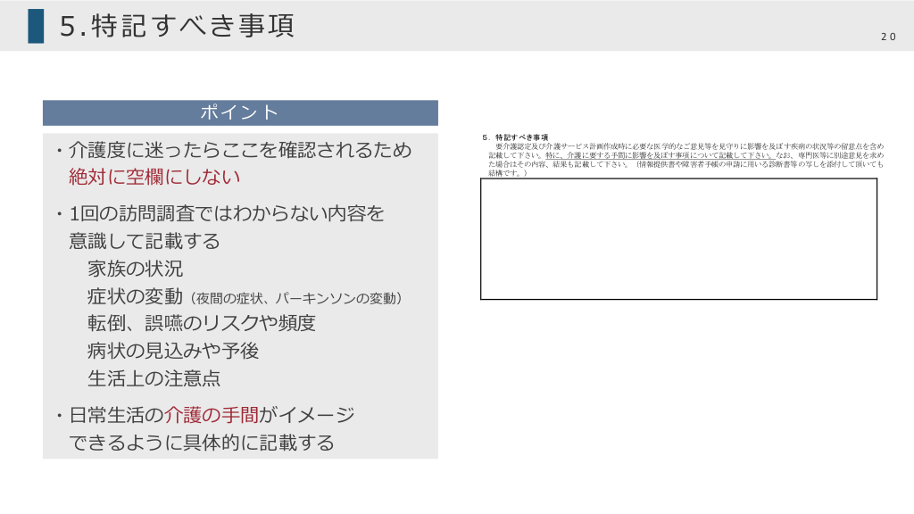 #20. 5.特記すべき事項 ポイント ・介護度に迷ったらここを確認されるため 絶対に空欄にしない ・1回の訪問調査ではわからない内容を 意識して記載する 家族の状況 症状の変動(夜間の症状、パーキンソンの変動) 転倒、誤嚥のリスクや頻度 病状の⾒込みや予後 ⽣活上の注意点 ・⽇常⽣活の介護の⼿間がイメージ できるように具体的に記載する (4)サービス利用による生活機能の維持・改善の見通し □期待できる □期待できない □不明 (5) 医学的管理の必要性(特に必要性の高いものには下線を引いて下さい。予防給付により提供されるサービスを含みます。) □訪問診療 □訪問看護 □訪問歯科診療 □訪問薬剤管理指導 □訪問リハビリテーション □短期入所療養介護 □訪問歯科衛生指導 □訪問栄養食事指導 □通所リハビリテーション □老人保健施設 □介護医療院 □その他の医療系サービス( ) □特記すべき項目なし (6) サービス提供時における医学的観点からの留意事項(該当するものを選択するとともに、具体的に記載) □血圧( )□摂食( )□嚥下( ) □移動( )□運動( )□その他( ) □特記すべき項目なし (7) 感染症の有無(有の場合は具体的に記入して下さい) □無 □有 ( ) □不明 20 5.特記すべき事項 要介護認定及び介護サービス計画作成時に必要な医学的なご意見等を見守りに影響を及ぼす疾病の状況等の留意点を含め 記載して下さい。特に、介護に要する手間に影響を及ぼす事項について記載して下さい。なお、専門医等に別途意見を求め た場合はその内容、結果も記載して下さい。(情報提供書や障害者手帳の申請に用いる診断書等の写しを添付して頂いても 結構です。) 11
